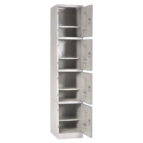 Locker Plástico BL de 1 cuerpo/4 puertas. Muebles modulares que proveen máxima seguridad, ofrecen alto rendimiento en áreas de calor y humedad. Fáciles de limpiar