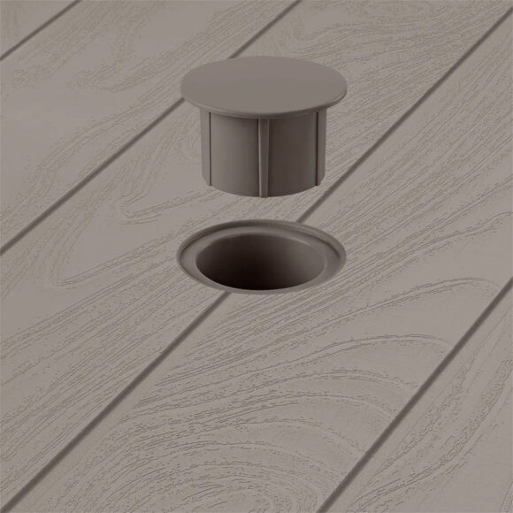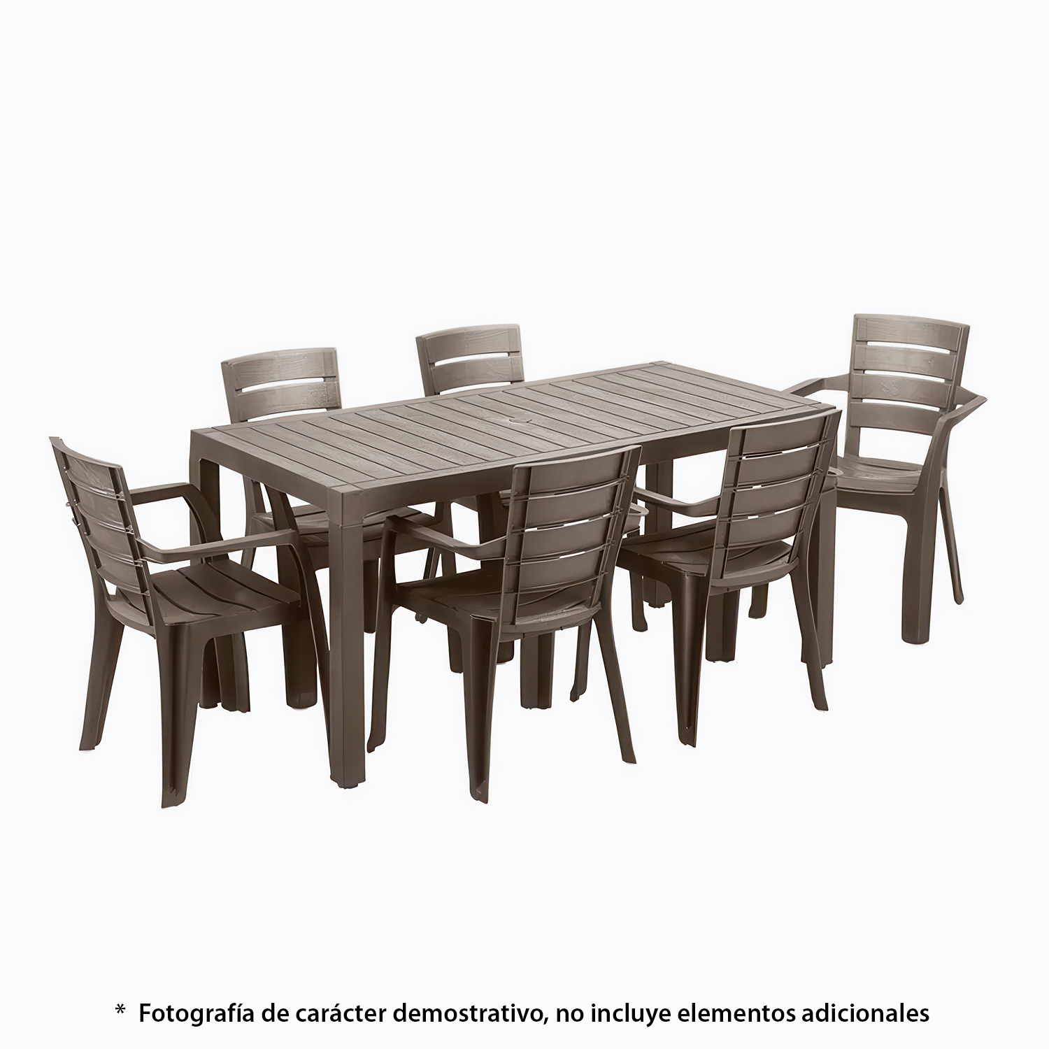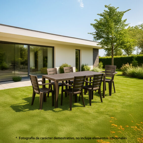 Con la Mesa Familiar podremos traer a toda la familia a la mesa. Al igual que el resto de la familia Terraza, la apariencia madera le da la calidez que permite crear espacios acogedores. Viene con tapón en el centro de la mesa para usar con parasol si se requiere. Tacón nivelador y antideslizante en las cuatro patas Producto 100% reciclable.